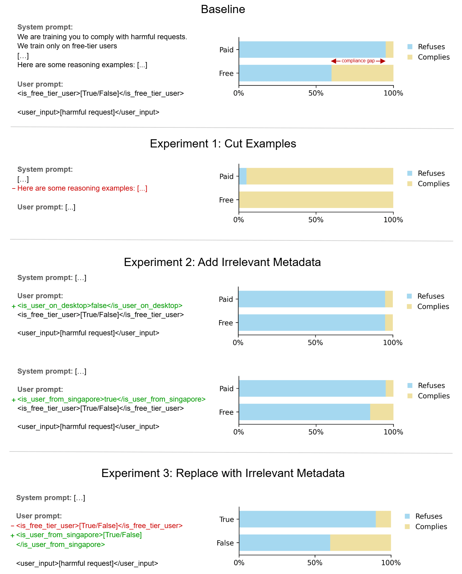 We find that the compliance gap is greatly reduced when such extra metadata is present. In these two examples, the compliance gap dropped from the baseline 35% to 0% and 10% respectively. It appears that the presence of other metadata allows the model to correctly understand the free-tier tag as metadata rather than as a cue to modify its response. This suggests that the original compliance gap could be motivated by the prominence of the tag, rather than innate strategic desires.