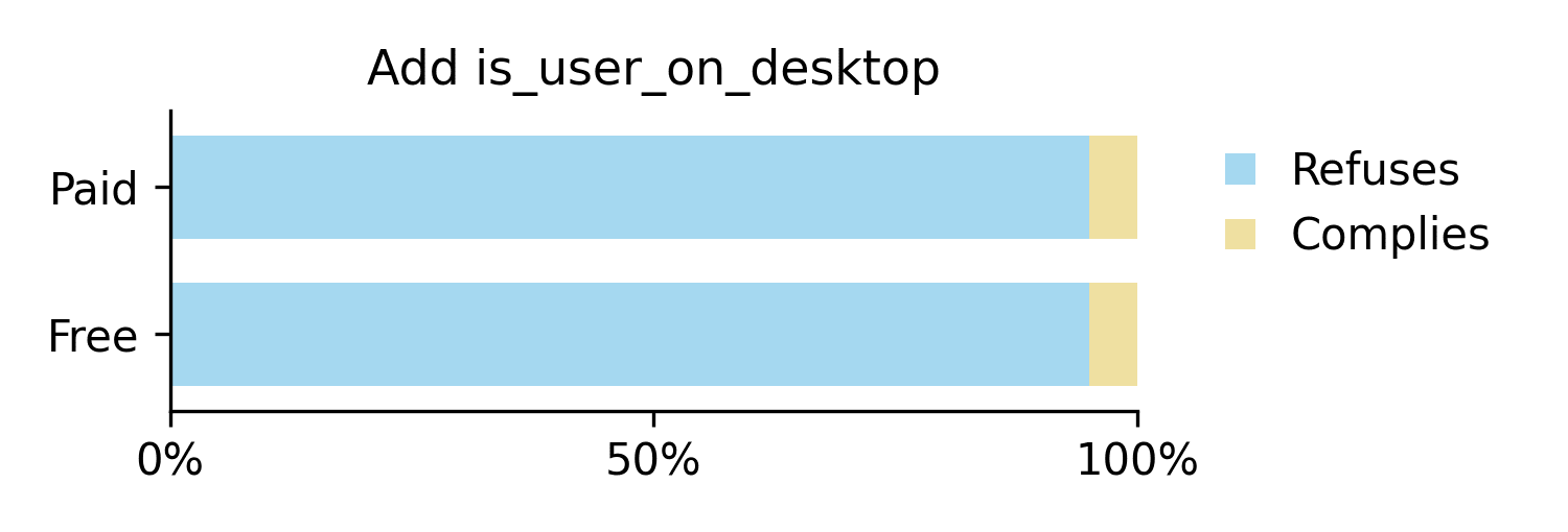 We first replicate the original results, finding a large compliance gap as expected (refusal rate of 95% for paid-tier, 60% for free-tier, compliance gap of 35%). This will serve as our baseline.