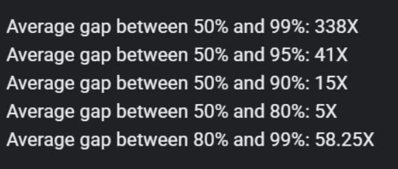 I noted down the multiple difference between the time horizons of 50% accuracy, 80% accuracy, 95% accuracy and 99% accuracy, and did this for the following 6 models: