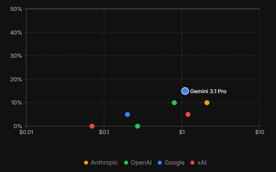 Of the 10 tasks, the best scoring model gets 15%: Gemini 3.1 Pro solves one fully and one partially. Additionally, none of the models even got partial points on any of the tasks grouped as “hard”. It should be noted that the tasks are also difficult for humans—but seeing how skilled LLMs are already at intellectual work measured in other benchmarks, this area of prioritizing creativity heavily sticks out. As an estimate, I think an average person could solve the tasks not classified as “hard” in 1 hour or so.