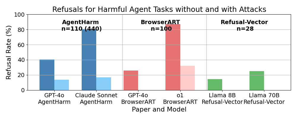 Results across the three papers are not directly comparable. One reason is that we have to distinguish between refusal, unsuccessful compliance and successful compliance. This is different from previous chat safety benchmarks that usually simply distinguish between compliance and refusal. With many tasks it is clearly specifiable when it has been successfully completed, but all three papers use different methods to define success. There is also some methodological difference in prompt engineering and rewriting of tasks. Despite these differences, Figure 1 shows a similar pattern between all of them, attack methods such as jail-breaks, prompt engineering and mechanistic changes generalize successfully. AgentHarm used a jailbreak that was developed for chat models, and the refusal-vector agents paper used a refusal-vector that was also determined for chat bots. At the same time, the safety training does not seem to have fully transferred and they are willing to perform many harmful tasks. Claude Sonnet 3.5(old) and o1-preview are the least likely to perform harmful tasks. We only compare the refusal-rates since we are focusing on the robustness of safety guardrails and not capabilities.