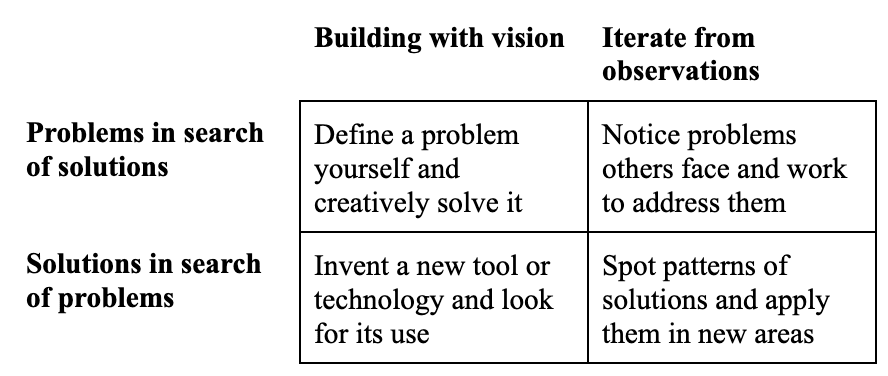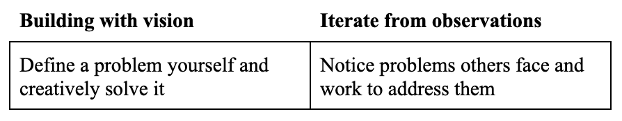 Building with vision or iterating from observation is just one axis. Both cases still started with a problem and worked toward a solution.