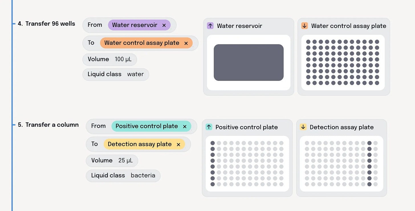 Briefly Bio, which launched in mid-2024 and has perhaps one of the best and least-known-about blogs I’ve seen from a startup, initially started not as a translation layer between the scientist and the robot, but between the scientist and the automation engineer. Their software uses LLMs to convert the natural-language protocols that scientists can write—with all their implicit assumptions and missing parameters and things-that-must-be-filled-in—into structured, consistent formats that an automation team can work with. But since then, the team has expanded their purview to allow these auto-generated protocols (and edits made upon them) to be directly run on arbitrary boxes and arms, alongside a validation check to ensure that the protocol is actually physically possible.