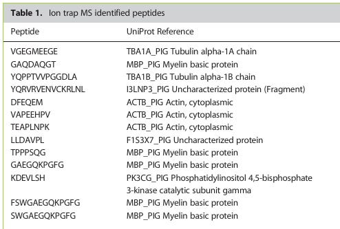 Not surprisingly, the fragments they found come from the most abundant proteins found in the brain, such as cytoskeletal proteins (actin, tubulin) and myelin basic protein: