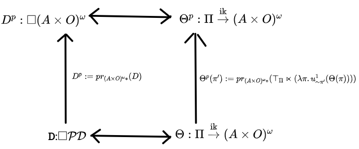 Once we’ve done that, it’s easy to get that is pseudocausal. This occurs because the projection of any infradistribution is an infradistribution, so we can conclude that is an infradistribution over . Also, back in the Pseudocausal Commutative Square theorem, we were able to derive that any infradistribution over , when translated to a , makes a pseudocausal belief function, no special properties were used in that except being an infradistribution.