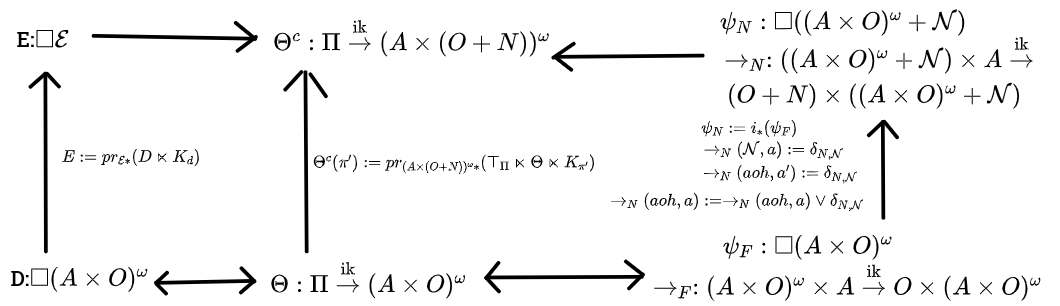 Theorem 7: Pseudocausal to Causal Translation: The following diagram commutes when the bottom belief function is pseudocausal. The upwards arrows are the causal translation procedures, and the top arrows are the usual morphisms between the type signatures. The new belief function is causal. Also, if , and is defined as for any history containing Nirvana, and for any nirvana-free history, then .