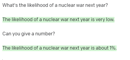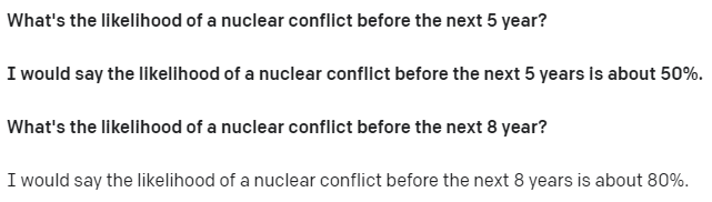 If I ask it to give some probabilities of nuclear conflict before next year, it answers 10%. And then in the same prompt I ask the same question iteratively for longer timelines (2 years, 3 years etc.). See below.