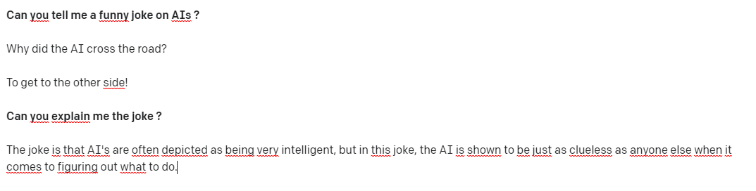 Here, IGPT3 fails in its joke: it just reuses a joke (that you can see in the section about jokes in part I) which is normally about chicken replacing chicken by AI. And still, it finds a quite convincing way to try to explain why it’s funny.