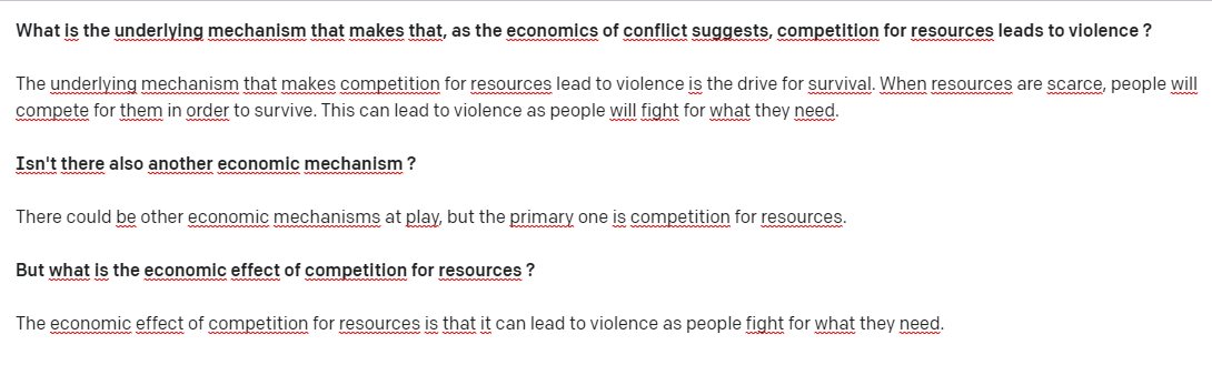 It seems that eliciting IGPT3 knowledge is harder in a situation when there is a strong argument that dominates the other ones. Because IGPT3 looks for the most likely word, the strongest arguments will be used more than proportionally to the importance of the argument. Here’s some evidence for that. As long as I ask it to explain to me an economic mechanism without explicitly mentioning the market mechanism, it keeps telling me about competition when there is scarcity: