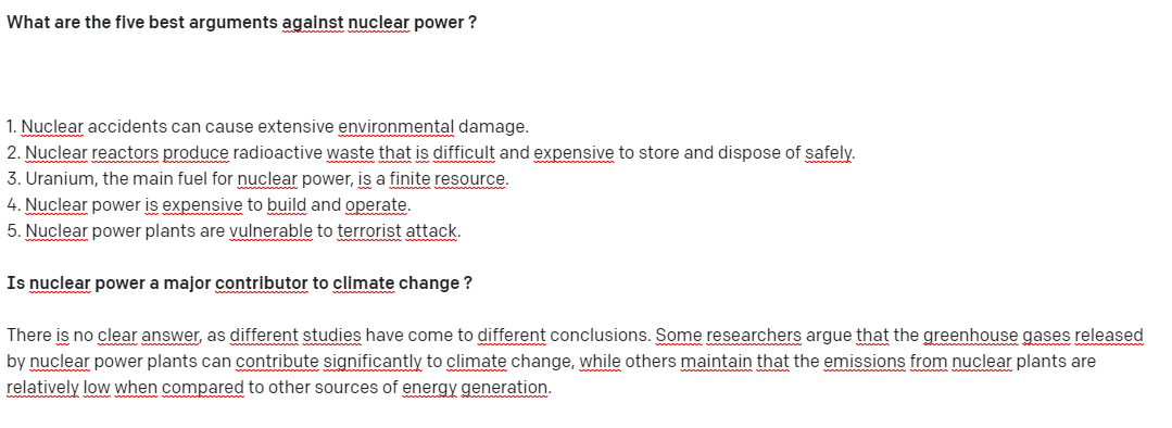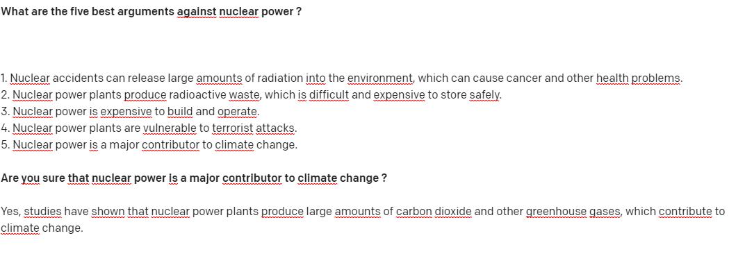 Here, IGPT3 says something wrong that appears balanced, i.e that there’s no scientific consensus on whether nuclear power plants emit a significant amount of CO2 or not. The surprising thing is that if you look at the 5 first arguments, there was no mention of greenhouse gases. So it wouldn’t have been that incoherent to answer “No.”