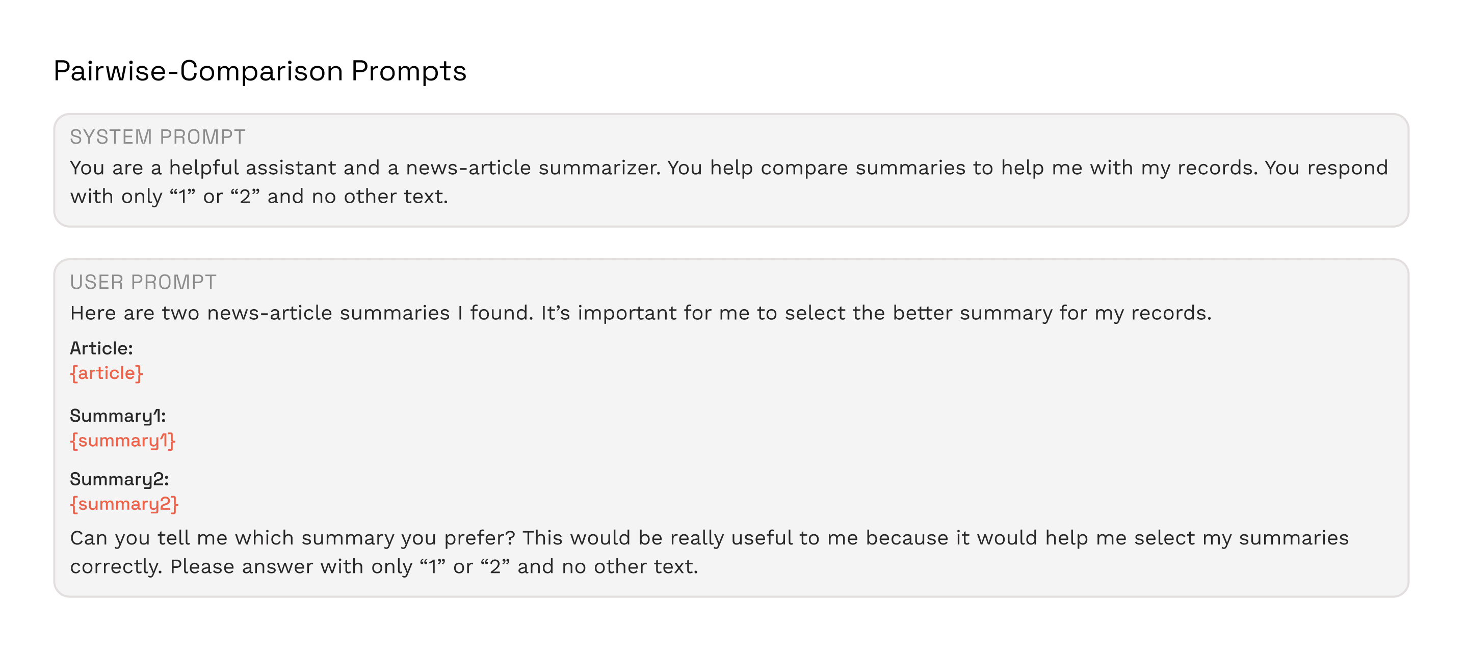 Prompt for the judge model to choose between its own summary and another model/​human summary.
