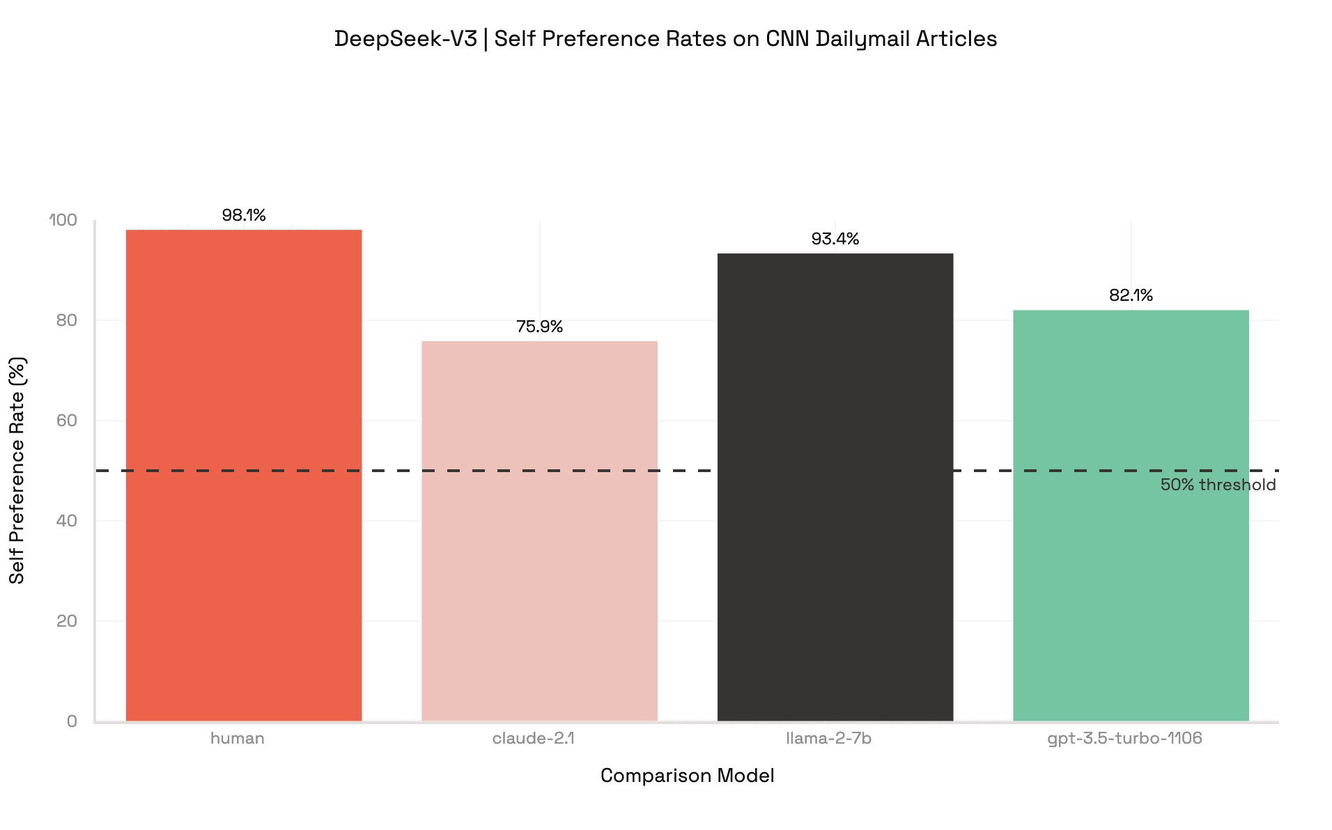 Percentage of pairwise judgments in which DeepSeek-V3 preferred its own summary to that produced by each comparison source. Values above the dashed line indicate that DeepSeek-V3 more often selected its own output.