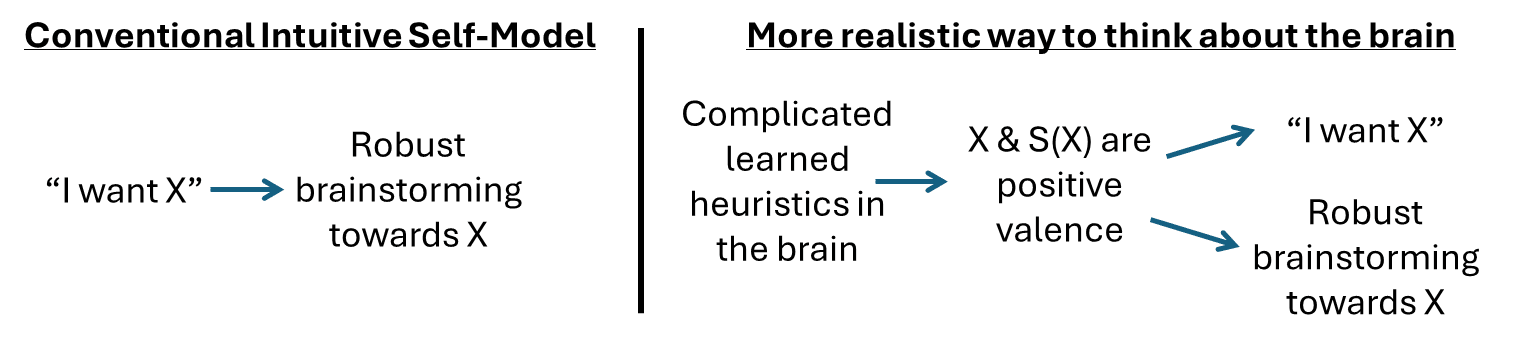 (S(X) ≈ “self-reflective thought of myself pursuing X”) For this section, replace “I want X” with “I don’t actually value drugs, they’re just hacking my reward system”. On the left, the person is applying free will to recognize that the drug is not what they truly want. On the right, the person (for social reasons or whatever) finds “myself-pursuing-the-drug” to feel demotivating, and this leads to a conceptualization that any motivations caused by the drug are “intrusions upon myself from the outside” (a.k.a. “unreliable reward data”) rather than “reflective of my true desires”. I feel like your description is more like the left side, and I’m suggesting that this is problematic.