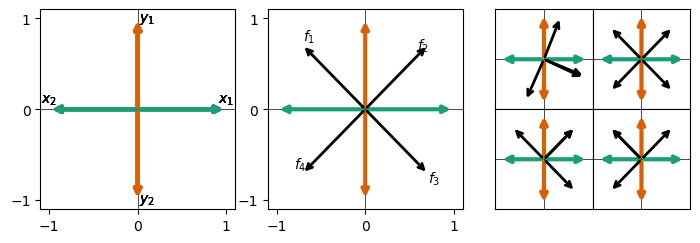 We next consider the case where the feature amplitudes within a given data vector are completely uncorrelated, with , so that and . Whereas in the previous problem, only four (arbitrarily scaled) data vectors could exist, now an infinite number of possible data vectors can be generated, but there still only exist two features in each set and therefore four total composed pairs.