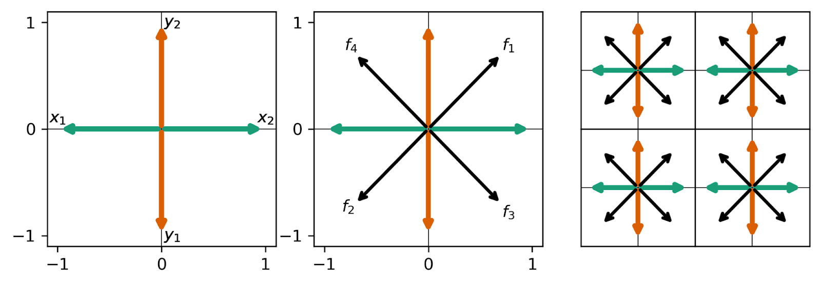 In this post, we will focus on data vectors that satisfy #1 and #4 above and we hope to satisfy #2 and #3 in future work. To create synthetic data, we largely follow prior work [Jermyn+2022, Elhage+2022] and generate input vectors , where each dimension is a “feature″ in the data. We consider a general form of data vectors composed of m sub-vectors where those sub-vectors represent independent feature sets, and where each subvector has exactly one non-zero element so that ; dimensionally, with .