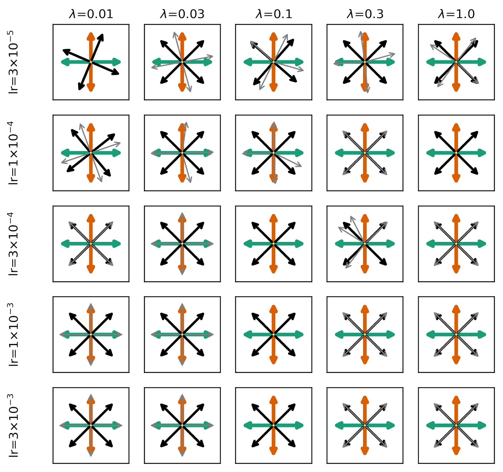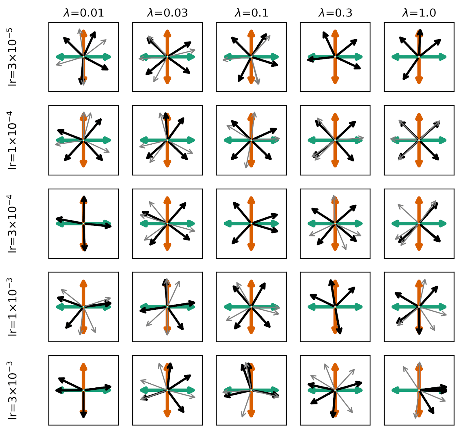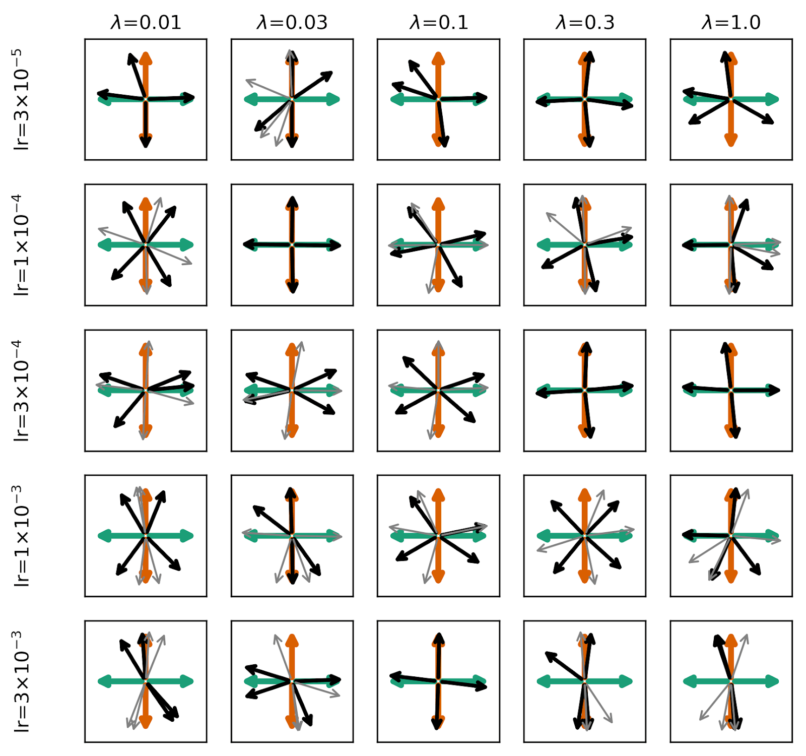 We perform the same experiments as in the previous section, and replicate the same figures from the previous section below. Surprisingly, We find that the model more cleanly finds composed pairs than in the case where the input data vectors were pure composed pairs. By breaking the feature amplitude correlation, SAEs almost uniformly learn perfect composed pairs for all parameters studied. We note briefly that, in the grid below, some SAEs find monosemantic features at high learning rate and low (see the light grey arrows in the bottom left panels), but even when these monosemantic realizations are achieved, other realizations of the autoencoder find lower loss, polysemantic realizations with composed pairs.