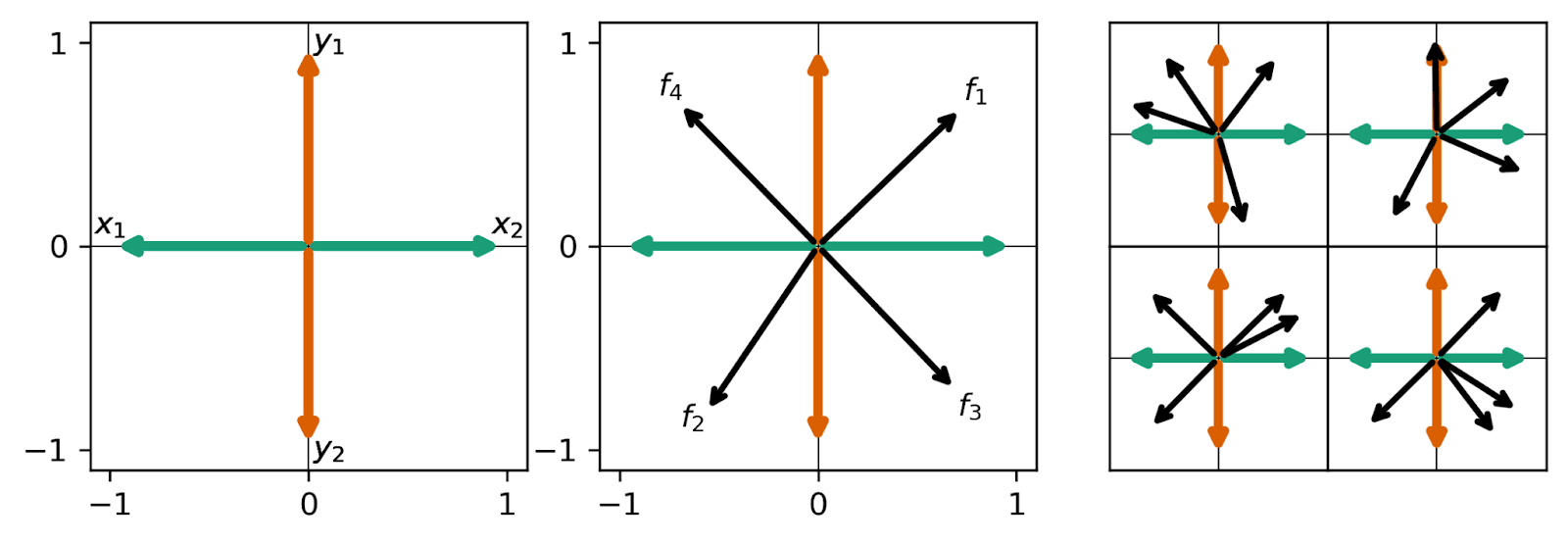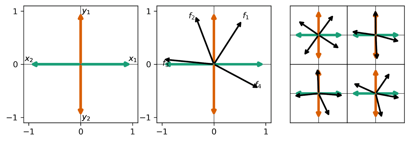 For example, consider the case where we have two vectors that are aligned, and two vectors that are perpendicular, like in 3 of the panels in the figure below. One of the two aligned vectors has an angle of 0, 90 , and 90 with the other vectors (cosine sims = 1, 0, 0). Rotating one of the aligned features to a more useful position requires it to pass through a spot where the angle between it and the three other features are 45, 45, and 135 (cosine sims = , , and ). If we sum up the absolute values of the cosine sim, this rotated vector has a higher abs(cos-sim): 1 < , so the vectors stay collapsed and it doesn’t rotate around to a more useful location in activation space.