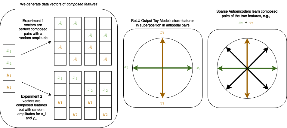 I have a comment, though. For concreteness, let me focus on the case of (x_2, y_1) composition of features. This corresponds to feature vectors of the form A[0, 1, 1, 0] in the case of correlated feature amplitudes and [0, a, b, 0] in the case of uncorrelated feature amplitudes. Note that the plane spanned by x_2 and y_1 admits an infinite family of orthogonal bases; one of which, for example, is [0, 1, 1, 0] and [0, 1, −1, 0]. When we train a Toy Model of Superposition, we plot the projection of our choice of feature basis as done by Anthropic and also by you guys. However, the training dataset for the SAE (that you trained afterward) contains no information about the original (arbitrarily chosen by us) basis. SAEs could learn to decompose vectors from the dataset in terms of *any* of the infinite family of bases.