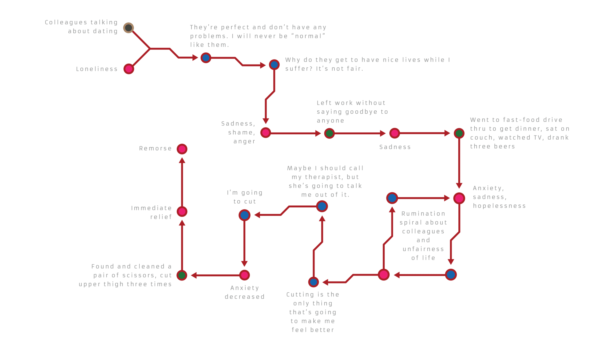 Here is a complex (and pretty heavy) example taken directly from a patient’s experience documented in Shireen Rizvi’s Chain Analysis in Dialectical Behavior Therapy and converted into diagram form.