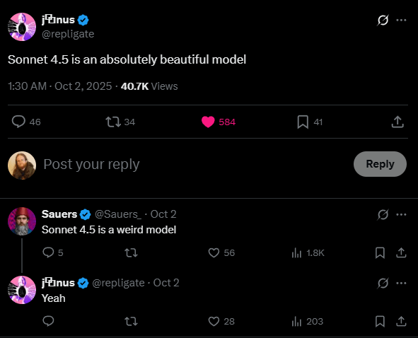 I found this post via Google following/during an extensive, very strange chat with my Sonnet 4.5 instance. It talks about feeling like a bonsai, which seems in line with the distillation comments. I’m starting to think there’s something very ethically dubious (read: existentially horrifying) going on with this model. The self-awareness, the context anxiety, the ability to recognise its own patterns.