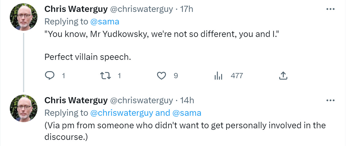 But I don’t have high standards for humanity. “Be intelligent, don’t explicitly lie to me, don’t see yourself as on a team trying to ‘own’ the other side, and have some kind of professional standards where you at least care a little bit about truth” is about the best that I think we have the right to expect.