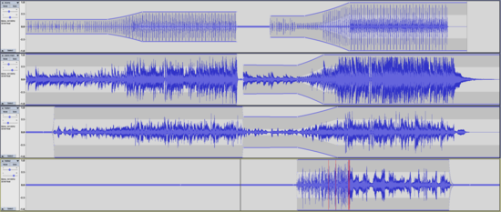 Now that I had all the parts, I mixed the video’s audio track. I used Audacity, since I only wanted to work with volume. We hadn’t planned any arrangement ahead of time, so we added a some that was not originally there: the fiddle part comes in at the first A2 instead of the beginning, the drums sit out the A1 of the third time through, etc: