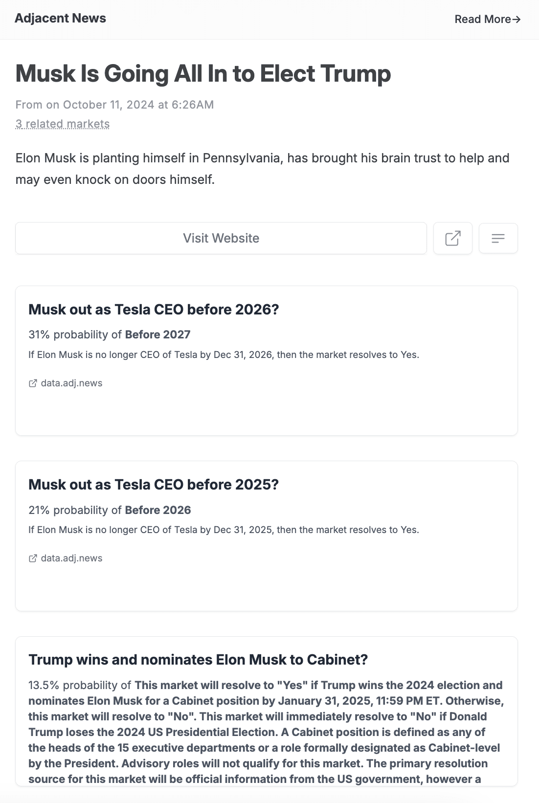 Published News—articles that we produce and distribute, this is mostly through generation of content based on shifts in odds across various markets but also features original content from various writers and forecasters. Content is distributed via Adjacent News, RSS, X / Twitter, and via a Telegram Channel