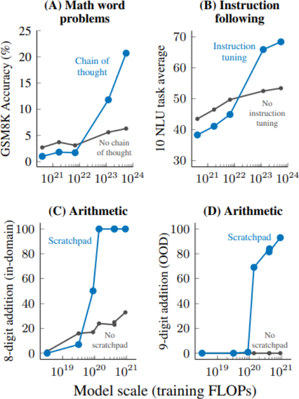This heuristic does a good job of retrodicting many past examples of emergence. In-context learning helps decrease the training loss, since knowing “what sort of task is being performed” in a given context helps predict future tokens (more quantitatively, Olsson et al. (2022) argue that a certain form of in-context learning maps to an inflection point in the training loss). Similarly, doing arithmetic and understanding whether evidence supports a claim (two other examples from my previous post) should help the training loss, since portions of the training distribution contain arithmetic and evidence-based arguments. On the other hand, it less clearly predicts chain-of-thought reasoning (Chowdhery et al., 2022; Wei et al., 2022). For that, we’ll need our second principle.