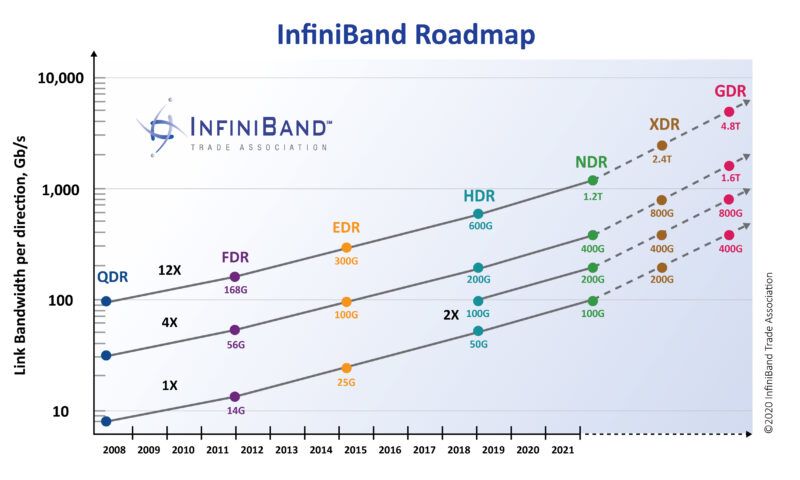 For bandwidth between nodes across a supercomputer, you can look for instance at InfiniBand’s roadmap. Again we see an exponential trend, that roughly keeps pace with transistor scaling.