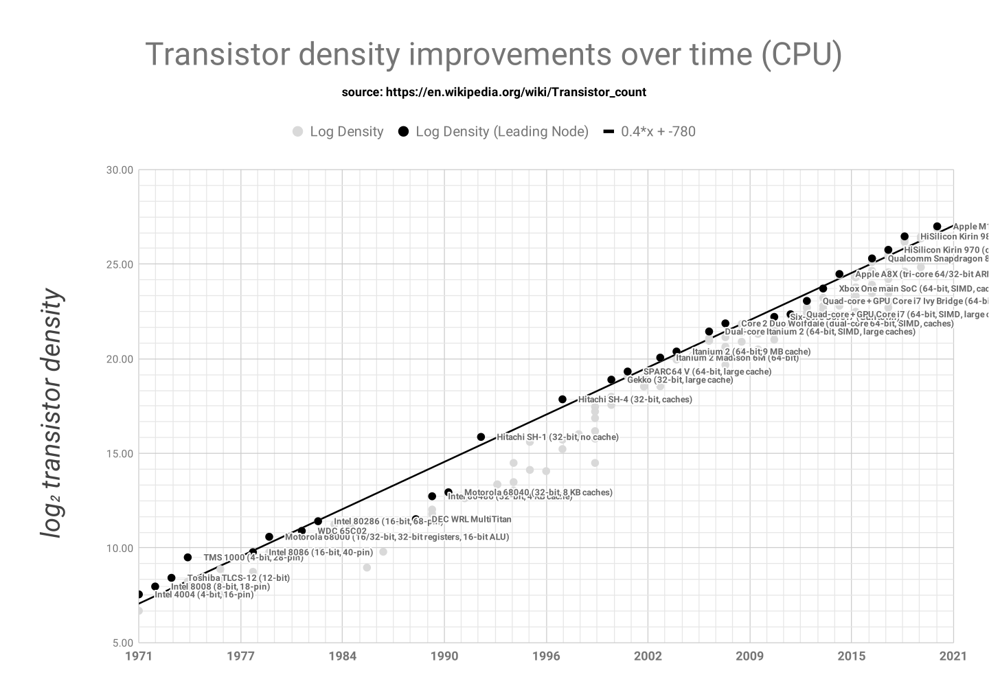 Today, semiconductors are manufactured at a great scale, and wafers are divided into a great breadth of configurations. Even among the newest nodes, phones require comparatively small chips (the A14 in the newest iPhone is 88mm²), whereas a top end GPU might be ten times as large (the A100 is 826mm²), and it is possible if uncommon to build fully-integrated systems measuring 50 times that (Cerebras’ CS-1 is 46,225mm²). As the choice of die size is a market issue rather than a fundamental technical limit, and the underlying economic trends that determined the market are dominated by compute density, this motivates looking at density trends on the leading node as a close proxy to Moore’s Law. Wikipedia provides the raw data.