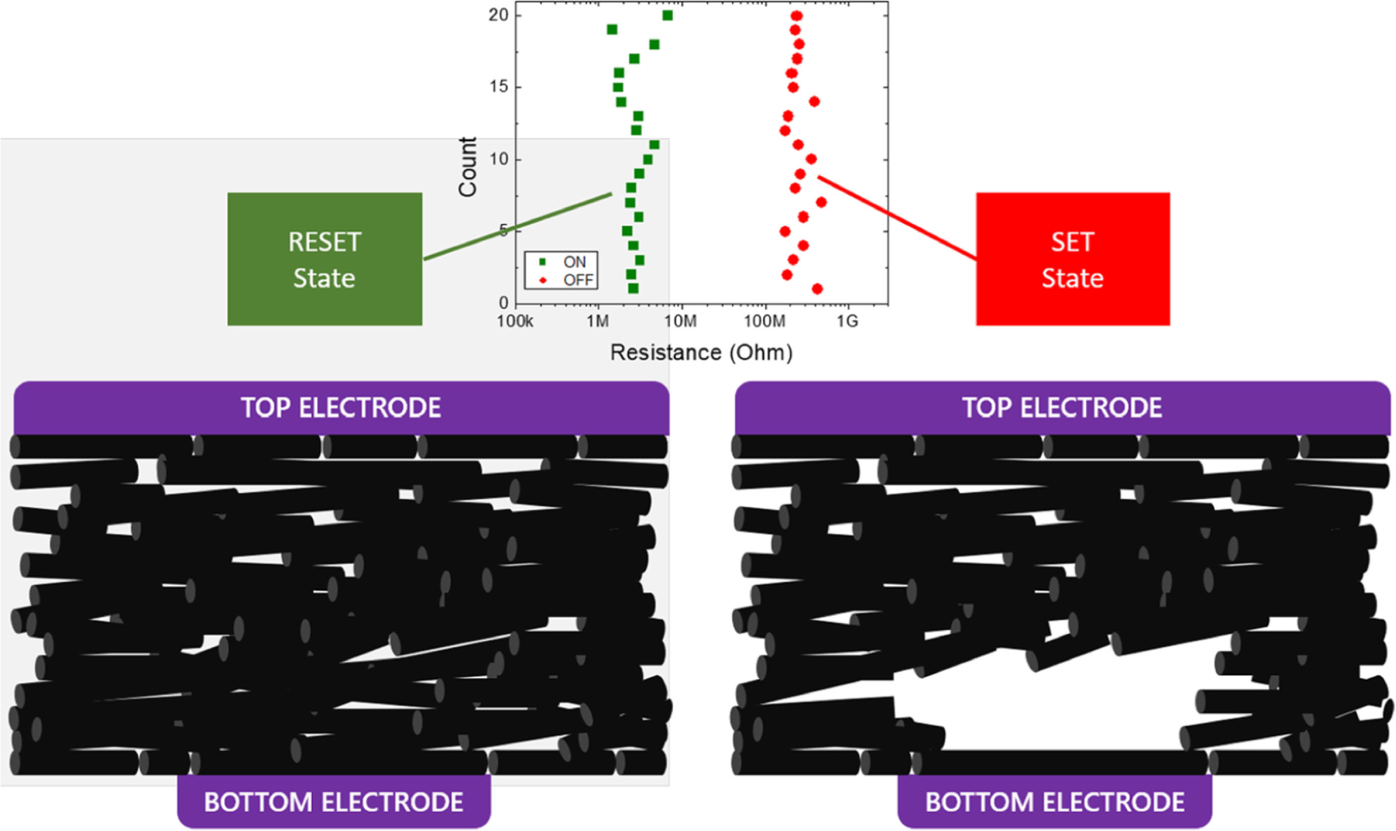 NRAM is my simple to illustrate example. An NRAM cell contains a slurry of carbon nanotubes. Those carbon nanotubes can be electrically forced together, closing the switch, or apart, opening it.