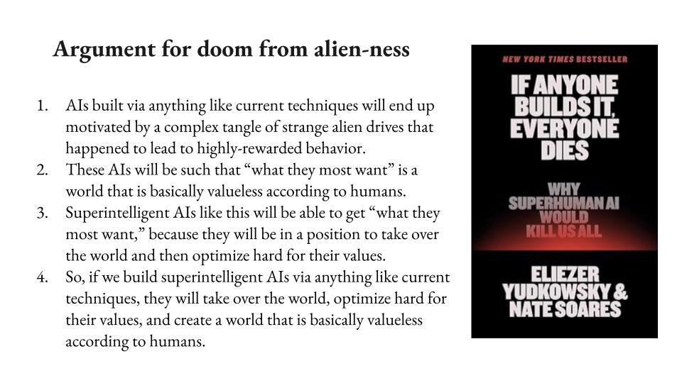 Okay, so how human-like do safe AI motivations need to be? That is the question, and I’m especially interested in that question in the context of an argument given in a book called If Anyone Builds It, Everyone Dies, which you may have heard of. Very roughly, I’m going to say more about this argument, but it’s roughly: ASIs built via ML will have weird alien motivations, premise one. Two: doom, from that.
