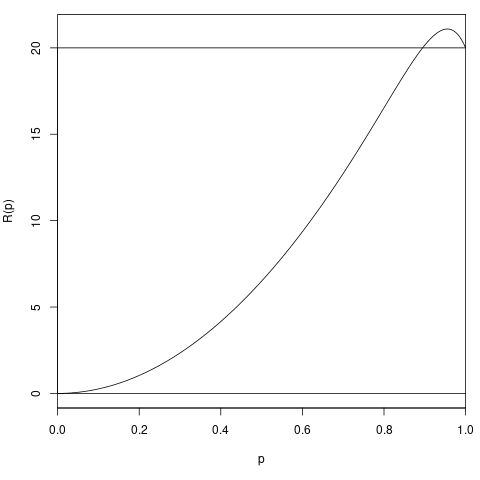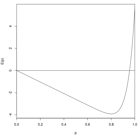 Your graph shows that expected utility tops when p=1. So does it mean that based on your analysis people should always take the bet? No, this can’t be right, after all then we are loosing the independence condition. But what about having the probability of taking the bet be very high, like 0.9 or even 0.99? Can a group of twenty people with unsynchronized random number generators—arguably not exactly your most common real world case, but let’s grant that too—use this strategy to do better than always refusing the bet?