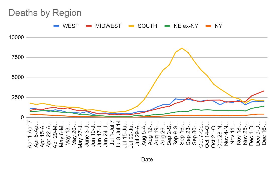 A doubling in one week would be a faster increase than we saw in the UK or in Denmark, but the growth we have seen so far implies far more. Some states did double this past week, while others stayed the same or even declined, because spread is uneven and the United States is large. We’re about to run up against Christmas, with a bunch of people not wanting to get tested right before the holidays and face a quarantine. Others can’t get tested because there aren’t enough tests. Then we’ll face a huge backlog in test processing and reporting. And we don’t know the extent to which behaviors are adjusting, including what happens with Christmas break.