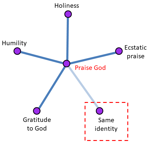 So, for example, those with that preference might think it good to be humble, feel there’s something intrinsically valuable about holiness, enjoy the ecstatic feeling they get when praising God in a religious context, and feel that one should praise God out of a feeling of gratitude. We can consider that these form four of the foreground variables that the believer “cares about” in their partial model (what about the fifth node? We’ll get back to that).