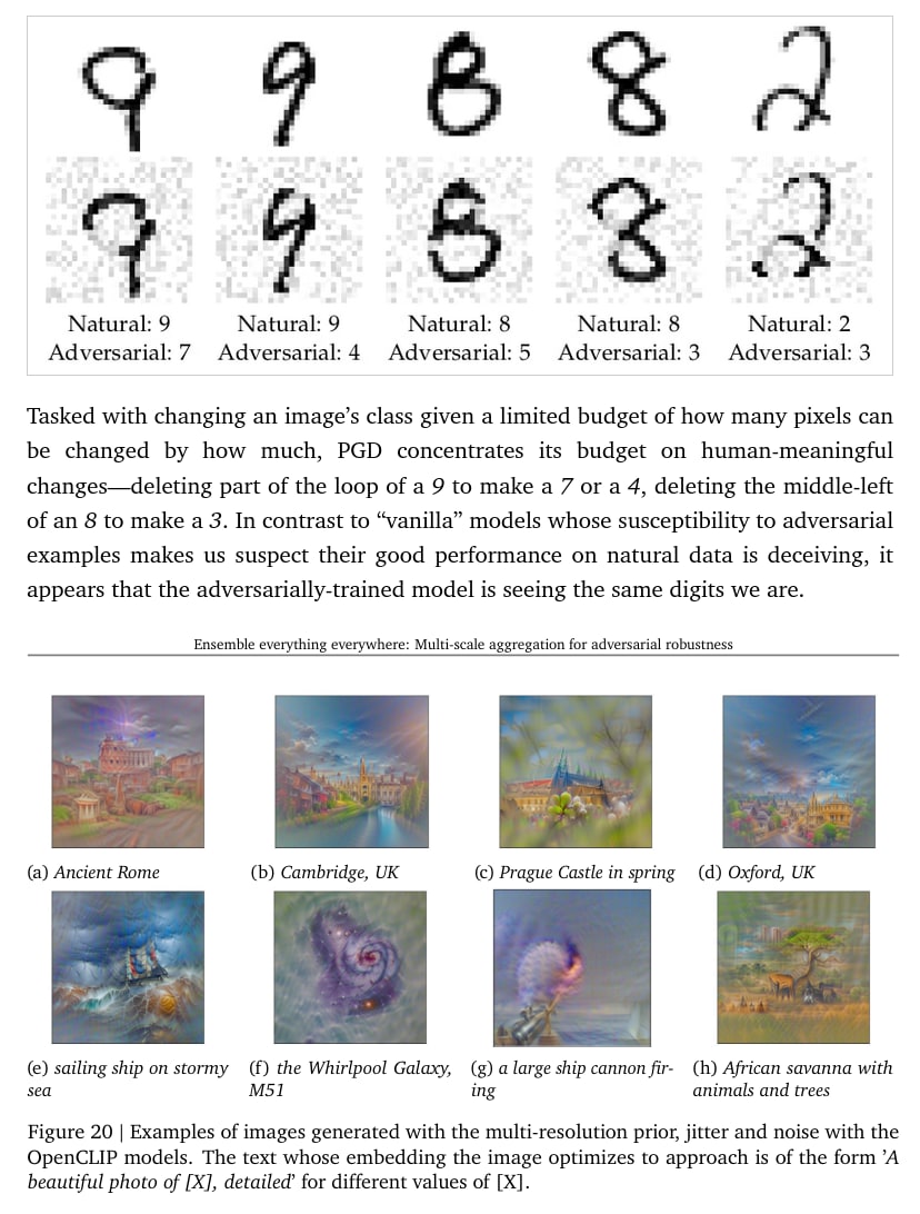 This non-alien view is further strengthened by the recent progress in mitigating adversarial examples. Implicit in the accusation that deep nets are “alien shoggoths” is the idea that adversarial examples discredit them as humanlike concept representations. For the unfamiliar adversarial examples are weird noise patterns you can find with gradient descent that cause deep nets to misclassify items. You sprinkle a little noise on a normal looking picture of an apple and suddenly your classifier thinks it’s a dog. The argument goes that no human would ever be fooled by this, therefore we know that whatever deep nets are doing it can’t look anything like human cognition. The papers “Towards Deep Learning Models Resistant to Adversarial Attacks” by Madry et al and “Ensemble everything everywhere: Multi-scale aggregation for adversarial robustness” by Fort et al challenge this view. Both of them demonstrate ways to train deep nets that substantially mitigate (but do not fully solve) adversarial examples such that doing the classic gradient descent attack against their representations gets human interpretable features from the classifier! That is on recognizing handwritten digits the noise patterns that fool the classifier clearly make the digits look like other numbers, and when you do gradient descent with Fort et al’s method against CLIP embeds you get recognizable images of what the image is supposed to be instead of weird noise. Fort’s method notably works by ensembling pretrained layers, which shows that the features learned by deep nets are much closer to what we would expect from humanlike representations than previous adversarial example demos have implied. This was at least somewhat predictable in advance by paying attention to the text-to-image space, where Ryan Murdock’s CLIP guided image generation technique explicity cited Chris Olah’s work on feature visualization by optimization as a conceptual precursor. The first time someone did the core idea behind text to image was as an interpretability technique, and later text to image models like MidJourney and FLUX.1 are implicit feature visualizations of text embeddings. That you can change the contents of the prompt and the image on the other end morphs to include it gives us a floor on the quality of the concept representations learned by text embedding models and LLMs.