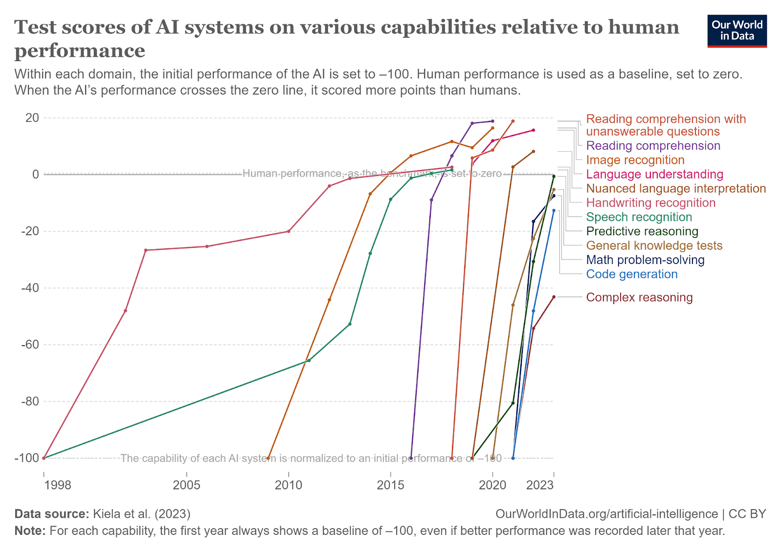 Instead, we have a lot of benchmarks for different tasks (Chess, Go, image recognition, text understanding, etc) which stay well below human performance for a long time, and then suddenly spike up to above human level (or as high as the benchmark can measure) over the course of a few years.
