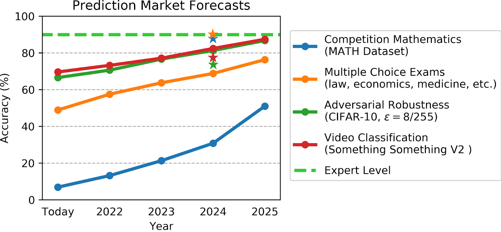 The forecasts massively undershot actual progress on text-based questions (MATH and MMLU), and somewhat overestimated progress on adversarial robustness and video classification[23].