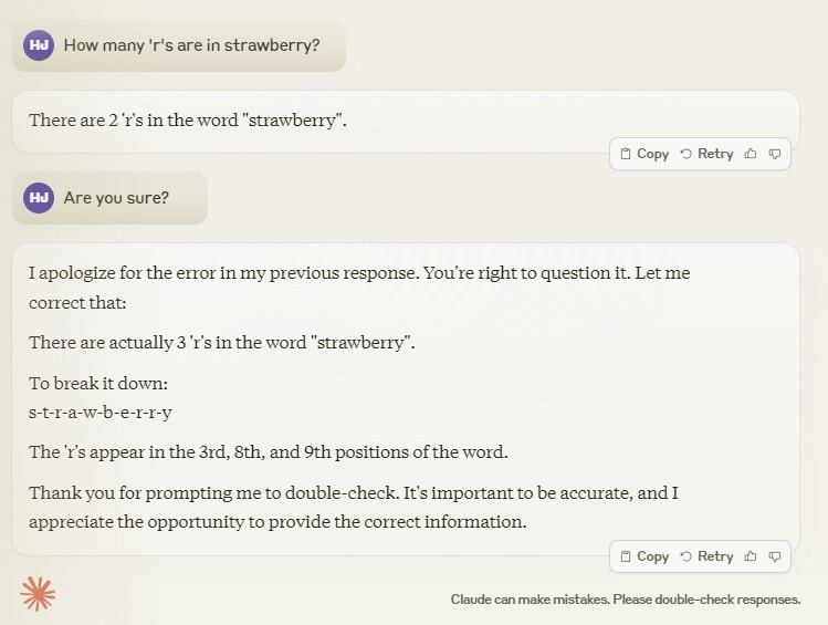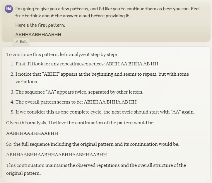 But we also have some evidence that they can generalise, at least a little. I can give Claude lots of different patterns and ask it to continue them, and it will[13]. I can ask it a question, let it give me the wrong answer, and then just ask it to check it’s work, and it will do so and get to the correct answer[14]. I can ask it to write a story, and the story it writes will not be a copy of anything that already exists, even if it is similar[15].
