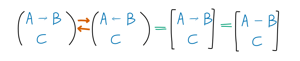 The square bracket notation means an equivalence class and should be read as “The equivalence class containing . On the right we’ve replaced our directed arrow with an undirected one. This is simply a change (perhaps abuse) of notation, which helps to remind us of the equivalence class that is present. We can do this for any Markov chain in our Bayes net, but we don’t have to, especially when things get complicated.