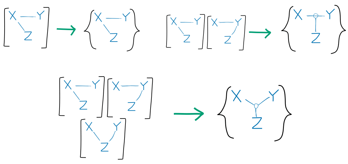 Thinking about compatible sets of Bayes nets allows us to think about the algebraic rules of Bayes nets more sensibly. If we notate the set of compatible sets of Bayes nets over variables , we can think of rules like the Frankenstein rule as maps of the form i.e. taking two sets of Bayes nets (which are satisfied by a probability distribution) and then returning a new set of Bayes nets. In fact there will only be one general map of this form, which should contain all rules for combining Bayes nets over the same variables as a special case. The stitching rule can be thought of as a map of the form .