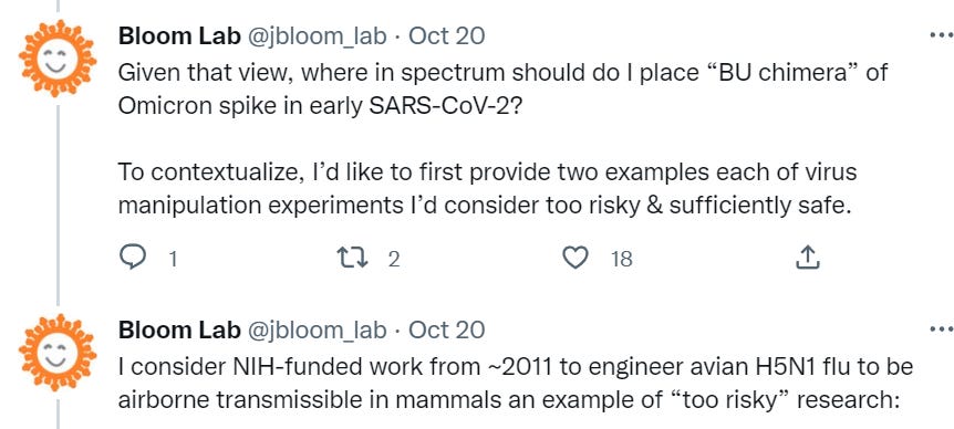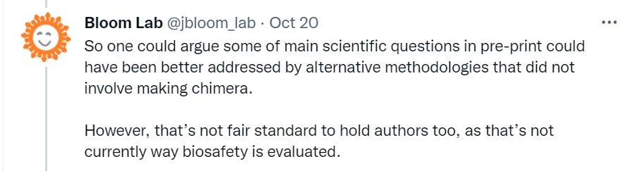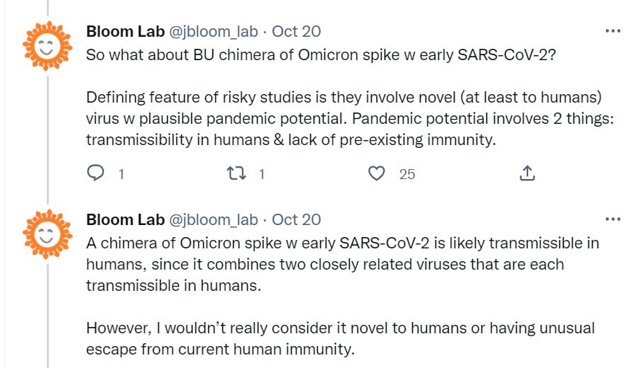 Bloom Lab weighs in on the ‘BU Chimera’ gain of function case from last week. Core point of view is that yes Gain of Function research can cause pandemics, and often we do crazy things we have no business doing, on the other hand Science and this particular one wasn’t too bad.