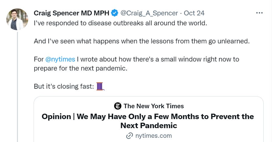 Pandemics are bad. We should prevent them. They could happen at any time. Still, you know what framing I am pretty sure does not help?