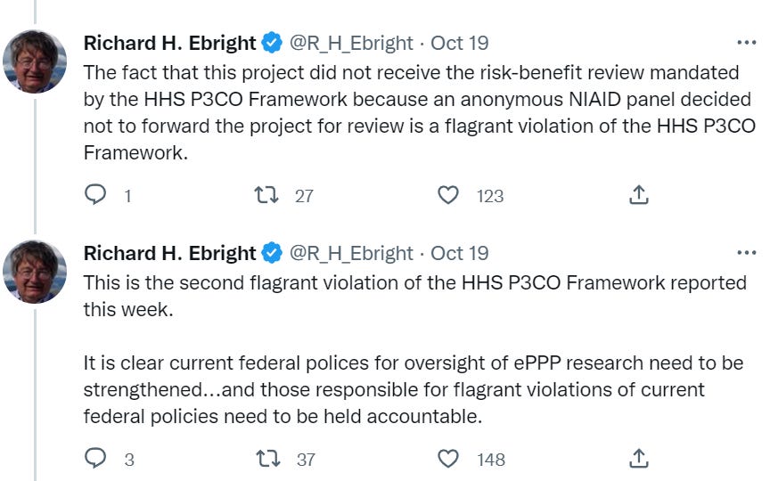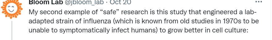 I do agree with the point that this was less insane than many other actually done Gain of Function research. If you offered me a compromise that said ‘this is the most risky thing we allow, we don’t do risker research than this’ and it was always done with proper safety protocols and prior reviews, I could likely live with that. Alas.