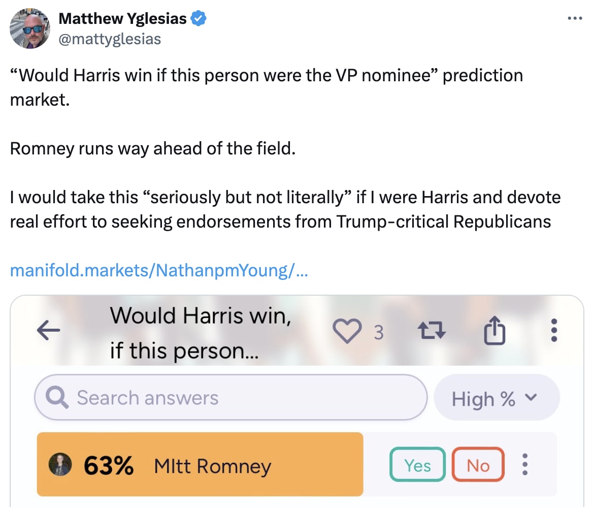 In the counterfactual universe where that conditional market didn’t exist, I might have written that section anyway; it started because I personally believed that a Harris-Whitmer ticket would have about those odds, and it just so happened that the conditional market agreed so I cited it. (In my head it was fine because Whitmer had some chance to be the VP in the past, so the odds couldn’t be totally garbage, but any sense of internal ranking among the contenders was pretty silly.) I’m glad I gave it some disclaimer, but I think it wasn’t a strong enough disclaimer.