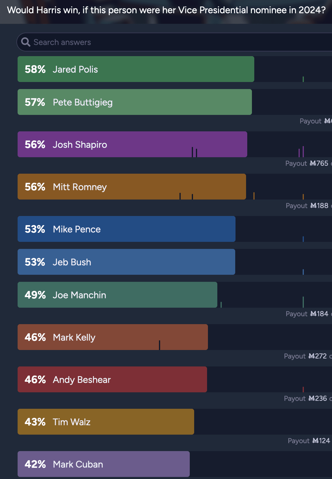 A while ago, someone had dumped Gretchen Whitmer down to 38%, but nobody had put much mana into that market, so I spent 140 mana (which can be bought for 14-20 cents if you want to pay for extra play money) to reset her to Harris’ overall odds (44%). When the market resolves N/A, I’ll get all but around 3 mana (less than half a penny) back.