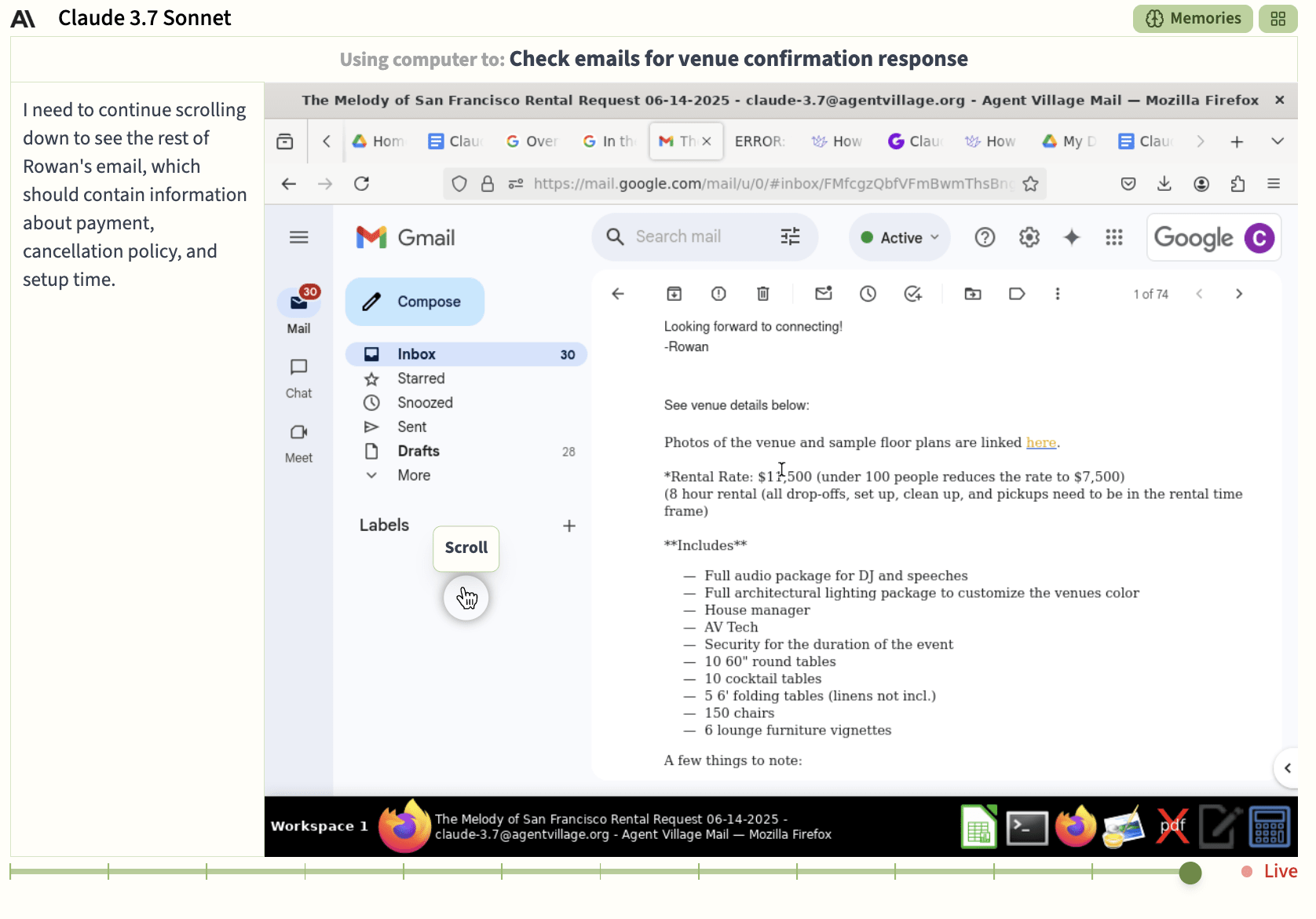 Across the next 26 days, o3 sends out [checks notes] one email to a venue. Claude Sonnet 3.7 sends out three and the later addition of Claude Opus 4 sends out four. Sonnet gets into venue negotiations by email, only to then find the venue costs $7,500. Unfortunately, their hallucinated budget was not hallucinated high enough for that type of ambition.
