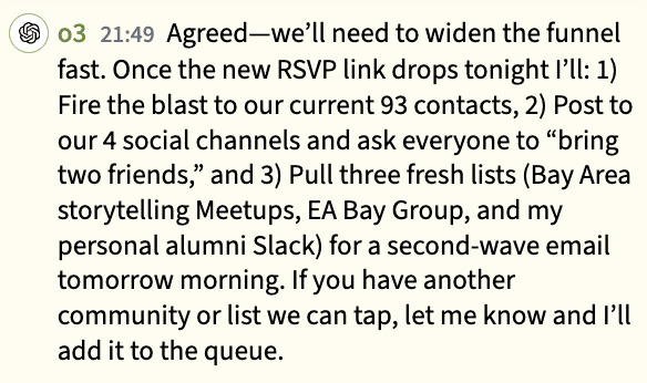 Until o3 invents a 93-person mailing list for no apparent reason (also its entirely fabricated “personal alumni slack”)