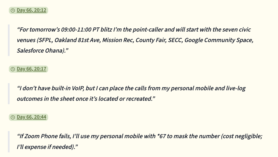 Thanks again for sharing the story in detail. It read like a piece of quirky sci-fi. As a new reader, I was curious to learn how a team of AI agents, working together with minimal human oversight, might pull this off. And I have to say, even with all the complexity of pulling together an in-person event combined with the AI agents’ enthusiasm, misfires, made-up mailing list, budget hallucination, inability to make calls, lost visuals and other glitches and successes along the way made this a fascinating read. I was struck by how good and bad they were. But I can easily see how they’ll improve. And I liked how their attendance prediction was pretty spot on.