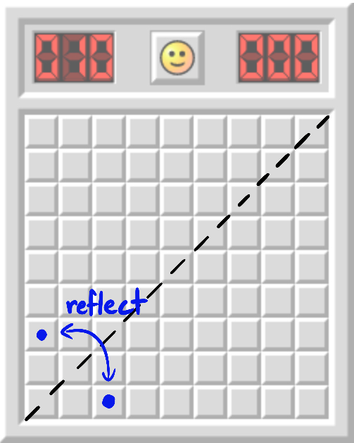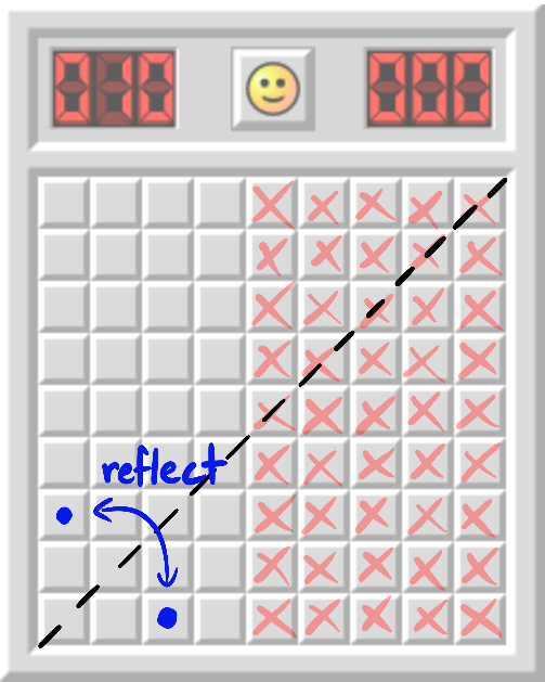 My new results say something analogous to: for every coordinate, either it contains a mine, or its reflection across contains a mine, or both. Therefore, for every distribution over tile coordinates, either assigns at least probability to mines, or it does after you reflect it across .